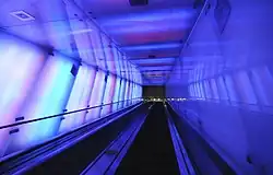 The Tunnel of Light is an artistic display of color and sound surrounding the escalator at the station.[11] 1800 fluorescent lamps and 44 speakers are installed behind a layer of glass along the corridor, steadily changing color and mood.[11] The theme is based on different experiences of travel in time and place. There are light and sound combinations for all seasons and all phases of life. The project was initiated by Kristin Jarmund.[9] The light system was developed by Per Åge Lyså at Intravision System, and the software that mixes sound and color was developed by Yngve Sandboe.[9] The music was composed by Bjarne Kvinnsland, mainly based on recorded samples. Among these are text written and performed by Beate Grimsrud.[12]