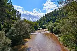A little further to the east, at 15.14 km (9.41 mi) from Olympia and 115 m (377 ft) elevation, is the right-bank tributary of the Alfeios, the Erymanthos, descending copiously from the heights of Mount Erymanthos through rapids. The mountain stream descends as a pebble-bottom ditch choked with vegetation from springs and waterfalls of the upper col until it reaches Tripotama as a good-sized, fast-flowing shallow river. There it enters Erymanthos gorge. There are no tracks along its whitewater extent through there until it reaches Haratsariou gorge, where there is a road crossing over an iron bridge, the Nemouta bridge. Southward from there a difficult hiking trail crosses the mouths of two ravines conducting additional water through a cascading region known as Nemouta Falls, some 30 waterfalls draining a wider region, which enhance the flow below.[12]
