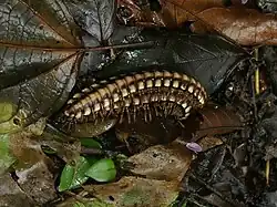 Nyssodesmus python also known as the python millipede or large forest-floor millipede is a species of flat-backed millipede of the family Platyrhacidae commonly found in Costa Rica, where it occurs widely and is locally abundant in the Caribbean slopes from sea level to around 365 meters (1,200 feet) in elevation.[1][2] Individuals reach lengths of up to 10 cm (4 in), and are conspicuously colored in yellowish tan with brown or black stripes. Their appearance is sometimes likened to a human spine. These millipedes are often encountered in pairs, with the male straddling the back of the female long after mating, to prevent other males from fertilizing the female's eggs before she lays them.[3]