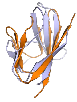 The ORF7a protein is a transmembrane protein with 121 amino acid residues in SARS-CoV-2[5] and 122 in SARS-CoV.[2] It is a type I transmembrane protein with an N-terminal signal peptide, an ectodomain that has an immunoglobulin fold, and a C-terminal endoplasmic reticulum retention signal sequence.[5][6][1] The structure contains seven beta strands which form two beta sheets, arranged in a beta sandwich.[2] Most of the sequence differences between SARS-CoV and SARS-CoV-2 occur in the Ig-like ectodomain and may produce differences in protein-protein interactions.[5]