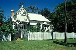 The dwelling is asymmetrical in form, with a steeply pitched roof, from which wide gables project on the main elevation and on the eastern side of the building. A corner bay window is carried through into the main roof and is expressed as a chamfered hip. Two tall brick chimneys protrude through the corrugated iron roof and the main section of the roof is capped with cast-iron ridge decoration. A short set of unbalustraded stairs leads to a wide verandah that wraps around to the northern elevation. The verandah is edged with a three-rail dowel balustrade and has a bullnose roof stepped-down from the main roof. The verandah porch is decorated with angular timber members in a pattern of triangles. This stick-style detailing is repeated on the main gable, which is decorated with an angular pattern of timbers which are held by brackets from the gable and barge boards. Under the gable is a bay window with a curved awning which is supported on large decorative timber brackets.[1]