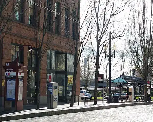 Oak Street/Southwest 1st Avenue is a light rail station on the MAX Blue and Red Lines in Portland, Oregon. It the 4th stop on the current Eastside MAX. It was previously also served by the Yellow Line, from 2004 to 2009, until that line's relocation to the Portland Transit Mall.