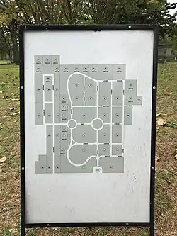The Oakland Cemetery Company Board dedicated the 180 acres for the purpose of a cemetery.[7] The company hired J. B. Buchanan as superintendent and landscape gardener. Benjamin Grove, a cemetery engineer, from Louisville, Kentucky, produced a design in the style of a rural, garden cemetery similar to Mount Auburn Cemetery near Boston.[8] The land that the cemetery company acquired was L-shaped, consisting of Blocks 1, 3 and 4 of the Floyd estate. "The spot was covered with a thick growth of trees."[5] While old oak trees were kept, landscape gardeners added rose bushes and graveled pathways to the land. Groves submitted a plan for a total of 120 acres of the 180 acres which then became the official plat of the cemetery which the cemetery association filed with the county.[9]