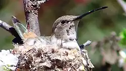 Little else is known about the oasis hummingbird's breeding phenology. It possibly nests throughout the year, though nests with eggs are known in Chile only between September and December. The cup nest is suspended from a tree or shrub branch. The clutch size is two eggs. Captive females have incubated the eggs for about 16 days, and fledging occurred about 27 days after hatch.[6]