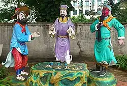 Temples known as "Sanyi Temples" (literally Temples of the Three Righteous) are dedicated to the three oath brothers. They can be found in many places such as Zhuozhou, where Liu Bei was from and the oath fictitiously took place, and Chengdu, the capital of Shu Han.[7]