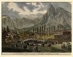 The running time has varied due to the many revisions that have taken place through the years. In 2010 it had a running time of 5 hours, beginning at 2:30 pm and ending at 10:00 pm, with a meal break. It was staged a total of 102 days and ran from May 15 until October 3 that year.[6] According to a record from 1930, the play then had running time of approximately seven hours. It started at 8:00 am and ended at 5:00 pm with a meal break.[7] Audiences come from all over the world, often on package tours, the first instituted in 1870. Admission fees were first charged in 1790. Since 1930, the number of visitors has ranged from 420,000 to 530,000. Most tickets are sold as part of a package with one or two nights' accommodation.