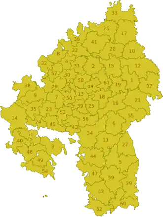 Chapter V of the Constitution contained detailed information on the administrative structure and rights of municipalities and official bodies. In particular, § 64 provided that Oberämter limits could only be changed by law, i.e. with the consent of parliament. This possibility was only used very sparingly; only in 1842 were major changes made, affecting around thirty municipalities.[7] A bill introduced by the government in 1911 to simplify administration in the sense of cost savings provided for only 42 Oberämter, but was rejected by the Chamber of Deputies.