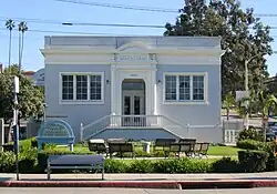 In December 1916, the commissioners of Santa Monica selected the site for the Ocean Park branch Carnegie library at 2601 Main Street.[2] The library was funded by a $12,500 grant from the Carnegie Corporation. The library was opened to the public on February 15, 1918. The library is one of the remaining pieces of the Carnegie legacy in Southern California. During World War II, the basement of the library was converted to a room for teens. It was also a place run by a temporary United Service Organization (USO) during the war. The city Landmarks Commission designated it as a Santa Monica historic landmark on May 3, 1977.[3]