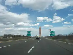 The Ocean Parkway begins at a cloverleaf interchange with the southern terminus of the Meadowbrook State Parkway and the Bay Parkway in Jones Beach State Park. Proceeding eastward, the Ocean Parkway parallels the Bay Parkway through Jones Beach State Park, running along the beachfront and past multiple recreational facilities. Just after a connection to the Bay Parkway, the four-lane parkway passes a parking lot for Jones Beach, along with a turnoff into a secondary lot for the bathhouse and the Jones Beach Theatre. In front of that turnoff, the westbound lanes pass two ramps that lead to a large parking lot that spans the gap between the Ocean and Bay parkways. After the parking lot, the Ocean Parkway enters a roundabout around the Jones Beach Water Tower (locally known as "The Pencil"), marking the southern terminus of the Wantagh State Parkway.[3][4]