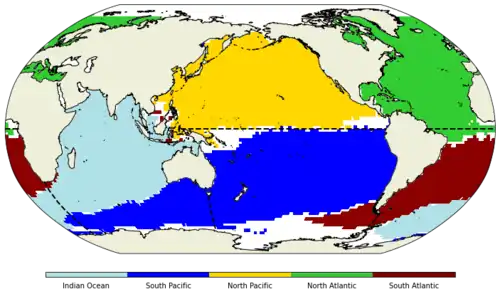 The flow in the ocean is not uniform but varies with depth. Vertical circulation in the ocean is very slow compared to horizontal flow and observing the deep ocean is difficult. Defining the ocean basins based on connectivity of the entire ocean (depth and width) is therefore not possible. Froyland et al. (2014)[7] defined ocean basins based on surface connectivity. This is achieved by creating a Markov Chain model of the surface ocean dynamics using short term time trajectory data from a global ocean model. These trajectories are of particles that move only on the surface of the ocean. The model outcome gives the probability of a particle at a certain grid point to end up somewhere else on the ocean's surface. With the model outcome a matrix can be created from which the Eigenvectors and Eigenvalues are taken. These Eigenvectors show regions of attraction, aka regions where things on the surface of the ocean (plastic, biomass, water etc.) become trapped. One of these regions is for example the Atlantic garbage patch. With this approach the five main ocean basins are still the North and South Atlantic, North and South Pacific and the Arctic Ocean, but with different boundaries between the basins. These boundaries show the lines of very little surface connectivity between the different regions which means that a particle on the ocean surface in a certain region is more likely to stay in the same region than to pass over to a different one.[7]