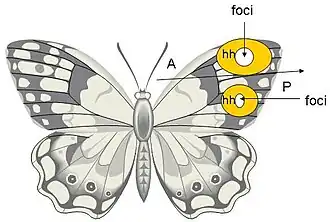 The Hedgehog (Hh) gene is the other element that has been functionally tested in the formation of eyespots. Investigating genes involved in wing development and morphogenetic activity has led to the discovery that Hh has a primary role in the morphogenetic signaling center of the foci.[23] In a manner that is similar to the development of Drosophila fruit flies, Hh is expressed in all cells in the posterior compartment of the developing butterfly wing during the mid fifth instar of butterfly wing development. However, in butterflies, Hh expression is significantly higher in those cells that flank the potential foci.[23] Higher transcription levels of Hh, along with other known associates of the Hh pathway, namely patched (Ptc) the Hh receptor, and cubitus interruptus (Ci), the Hh transcription factor is seen throughout the mid to late fifth instar as well, which further implies a role for Hh signaling in eyespot development and patterning.[23]