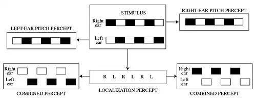 Deutsch proposed that when a single tone that alternates between octaves is heard, this illusion results from the combined operation of two decision mechanisms. First, to determine the tone's location, high pitches are given precedence; second, to determine the tone's pitch, tones in the dominant ear are given precedence over tones in the non-dominant ear.[3] This is known as the two-channel model, since it is proposed that the operation of two separate "what" and "where" decision mechanisms combine to produce the illusion. The model is illustrated here.