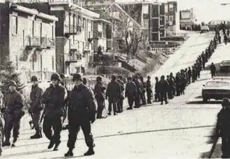 • October 15: Quebec City: The negotiations between the lawyers Lemieux and Demers are put to an end.[15][16] The Government of Quebec formally requests the intervention of the Canadian army in "aid of the civil power" pursuant to the National Defence Act. All three opposition parties, including the Parti Québécois, rise in the National Assembly and agree with the decision. On the same day separatist groups are permitted to speak[17] at the Université de Montréal. Robert Lemieux organizes 3,000 students in a rally in Paul Sauvé Arena to show support for the FLQ; labour leader Michel Chartrand announces that popular support for FLQ is rising[11] and states "We are going to win because there are more boys ready to shoot members of Parliament than there are policemen."[18] The rally frightens many Canadians, who view it as a possible prelude to outright insurrection in Quebec.