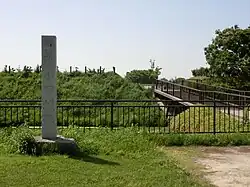 After the Meiji restoration, the outer area of the castle was lost to urban development, and the ruins of the castle were bisected by the tracks of the now defunct Kanto Railway Tsukuba Line (with the Visitor Center near the castle located on the grounds of the former train station). The main area of the castle remains relatively well preserved and archaeological excavations began to be carried out from 1997 through 2004.[2] A portion of its clay ramparts and marshy moats were restored and the site opened to the public in 2016 as the "Oda Castle Ruins History Plaza".
