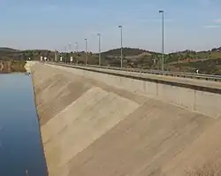 The Odeleite Dam (Barragem de Odeleite) was constructed in 1996 on the Odeleite River and serves as a key part of the water supply infrastructure in the Algarve region.[3] It has a crest length of 350 metres (1,150 ft), a height of 65 metres (213 ft), 50 metres (160 ft) of which are above the natural ground level, and a usable capacity of 117,000,000 cubic metres (153,000,000 cu yd) of water.[3][4] At full storage level of 52 metres (171 ft), the reservoir created by the dam has a total storage capacity of 130 hectometres (14,000 yd) and an inundated surface area of approximately 680.22 hectares (1,680.9 acres).[3][4]