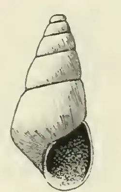 The shell is small, measuring 3.1 mm. It is regularly conic, bluish-white. The nuclear whorls are deeply and obliquely immersed in the first of the succeeding turns, above which only the tilted edge of the last volution projects. The 5½ post-nuclear whorls are slightly rounded. They are marked by fine retractive lines of growth and numerous fine, spiral striations. The sutures are strongly impressed. The periphery of the body whorl is subangulated. The base of the shell is rather short, sloping from the subangulated periphery to its anterior margin, with a tumid area bounding the narrow umbihcus, marked like the spire. The aperture is oval. The posterior angle is acute. The outer lip is thin. The inner lip is decidedly curved and reflected. The columella is provided with a strong oblique fold at its insertion. The parietal wall is glazed with a moderately thick callus.[3]
