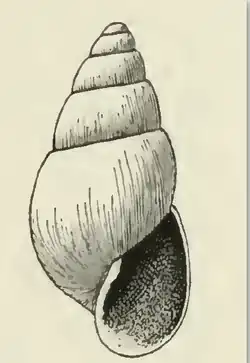 The milk-white shell is elongate-ovate, umbilicated, and measures 6.2 mm. The nuclear whorls are deeply, obliquely immersed in the first of the post-nuclear turns, above which only the tilted edge of the last whorl projects. The six post-nuclear whorls are moderately rounded. They are marked by faint lines of growth, and numerous microscopic spiral striations. In addition, the body whorl shows many shallow dents. The periphery of the body whorl and the moderately long base are somewhat inflated and well rounded. They are also marked like the spire. The large aperture is oval, while the posterior angle is acute. The outer lip is thin, while the inner lip is very oblique, slightly curved, and strongly revolute, extending partly over the umbilicus. It has a moderate fold anterior to its insertion. The parietal wall is glazed with a thin callus.[4]
