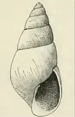 The first two turns are divided into five, almost equal areas by four equally, strongly incised, spiral Iines, between the sutures. On the third whorl the spiral lines are increased to about a dozen and are considerably less strong; on the succeeding turn they are probably almost tripled and still weaker; while on the penultimate volution the sculpture consists of somewhat wavy, closely spaced, spiral striations. The periphery of the body whorl is obscurely angulated, and somewhat inflated. The base of the shell is moderately long, curving gently to the anterior portion of the shell. It is marked like the body whorl with fine, spiral lines. The sutures are somewhat constricted. The oval aperture is moderately large. The posterior angle is obtuse. The outer lip is thin. The inner lip is rather long, slightly curved, and somewhat revolute. It is provided with a strong fold at its insertion. The parietal wall is glazed with a thin callus.[3]