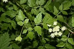 Oenanthe sarmentosa is a species of flowering plant in the family Apiaceae known by the common name water parsley. It is native to western North America from Alaska to California, where it grows in wet areas, such as streambanks. It is sometimes aquatic, growing in the water. The plant has been used in cultivation in wetlands, and the recent discovery of several colonies growing by a stream in Illinois demonstrates its capacity to become a noxious weed if it is introduced elsewhere.[1] This is a perennial herb growing to a maximum height near 1.5 meters. The leaves have blades up to 30 centimeters long borne on petioles up to 35 centimeters in length. The parsley-like leaf blade is divided into serrated, lobed leaflets. The inflorescence is a compound umbel of many flowers with bright white to red-tinged petals.