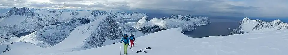 Backcountry skiing (US), also called off-piste (Europe), alpine touring, freeriding or out-of-area, is skiing in the backcountry on unmarked or unpatrolled areas either inside or outside a ski resort's boundaries.[1] This contrasts with alpine skiing, which is typically done on groomed trails benefiting from a ski patrol. Unlike ski touring, backcountry skiing can – and often does – include the use of ski lifts including snowcats and helicopters. Recent improvements in equipment have increased the popularity of the sport.[2] As the sport does confront the individual practicing it with the dangers of natural, unprepared alpine terrain like avalanches, it is generally recommended to carry standard safety equipment and to learn beforehand how to behave safely under such conditions.