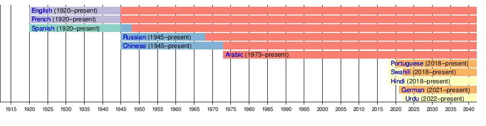 There are six official languages used in United Nations (UN) meetings and in which the UN writes and publishes all its official documents.[1] In 1946, five languages were chosen as official languages of the UN: English, French, Russian, Spanish, and Chinese.[2] In 1973, Arabic was voted to be an additional official language. As of 2025,[3] the official languages of the United Nations are: