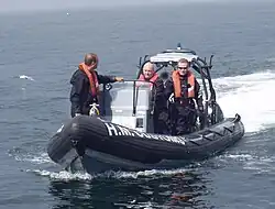 The Cornish Maiden (which belonged to Berriman[8]) motored to a position 12 miles off Hartlepool, where it anchored and made ready for trade.[9] By this time, a 42-metre (138 ft) Customs cutter was waiting, and stayed in attendance throughout daylight hours. Hartlepool residents who came out to buy goods were followed back to shore by a Customs RHIB from the cutter. Potential buyers were scared off when Customs then announced that they would "seize any boat that visited" the Cornish Maiden.[10] From then on, no sales were made, except to journalists and cameramen from national newspapers. These media people bought token amounts of goods, but on arrival onshore, these goods were either seized or extra duty demanded. There were no further sales, and after the cutter gave warning that another storm was imminent, the Cornish Maiden packed up and headed for port.