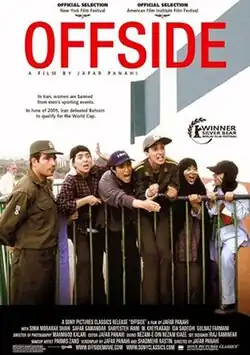 Offside (Persian: آفساید) is a 2006 Iranian film directed by Jafar Panahi. The film is about a group of girls who try to watch a World Cup qualifying match but are forbidden by law because of their gender.[2] Female fans are not allowed to enter football stadiums in Iran on the grounds that there will be a high risk of violence or verbal abuse against them.[3] The film was inspired by the director's daughter, who decided to attend a game anyway.[4] The film was shot in Iran but its screening is banned there.[3]