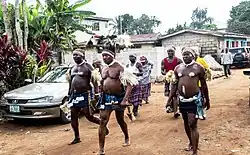 The Ohafia War Dance which is also performed to celebrate an individual's achievement is headed by a lead dancer carrying a basket full of human skulls (Igbo: oyaya) while holding a short cutlass and a small palm shoot in his mouth, while his fellow dancers dressed like fierce warriors mime the cutting off of human head while dancing to the music from the akwatankwa musical instrument thus portraying Ohafia as a land of brave warriors.[5][6]