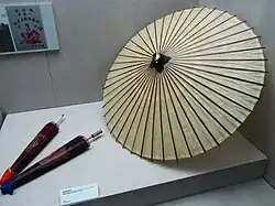 The origin of oil-paper umbrellas could be traced to those fabric canopies brought from Korea to Japan during the Asuka period, which samples are preserved among the Shōsōin treasures.[4][5][6] Initially, the oil-paper umbrella was a sacred instrument in Buddhist ceremony. During the Heian period, techniques in paper production and bamboo work advanced. In the Muromachi period, pigments and wax were applied to the surface of the paper for additional resistance to water.