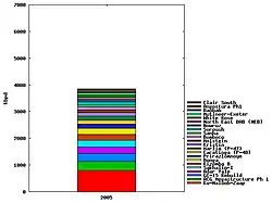 This page summarizes projects that brought more than 20,000 barrels per day (3,200 m3/d) of new liquid fuel capacity to market with the first production of fuel beginning in 2005. This is part of the Wikipedia summary of Oil Megaprojects—see that page for further details. 2005 saw 23 projects come on stream with an aggregate capacity of 3.951 million barrels per day (628,200 m3/d) when full production was reached (which may not have been in 2005).