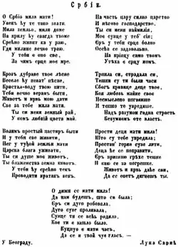 Oj Srbijo, mila mati (Serbian Cyrillic: Ој Србијо, мила мати), translated "O Serbia, Dear Mother",[1] is a Serbian patriotic song. It dates to the 19th century. Its first, longer version, Srbiji ("To Serbia") by poet Luka Sarić was published in 1860 in the literary magazine of Slovenka in Novi Sad.[2] In 1891, a Czech migrant to Serbia, Vojtěch Šístek, a member of the Singing Association Branko in Niš, composed the melody and the song quickly became very popular.[2] A very long song, with seven stanza with eight lines each, it was shortened in 1909 by another member of the Branko association, Dragomir Brzak, to four stanza with four lines each.[2] This version, with the name Oj Srbijo (O, Serbia) entered the school program prior to World War I.[2] It was very popular during the Balkan Wars and World War I, having entered the repertoire of the Royal Guard.[2] It was the opening song in a 24 June 1917 concert of the Serbian Royal Guard in Versaille.[2] During World War II, it was the unofficial anthem of the Serbian puppet Council of Ministers.[2] It has been theorized that the original writer, Luka Sarić, was a pseudonym, since no information has been found on him; it has been assumed that Prince Mihailo was the writer, his 1861 song Što se bore misli moje having the same rhythm.[2]