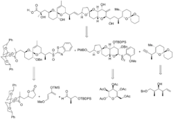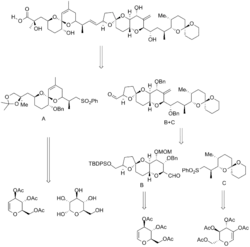 In Isobe's synthesis, the molecule was broken into three pieces, along the C14–C15 bonds, and the C27–C28 bonds. This formed fragments A, B, and C, which were all synthesized separately, after which the B and C fragments were combined, and then combined with the A fragment. This synthesis contained 106 steps, with a longest linear sequence of 54 steps. The precursors to all three fragments were all glucose derivatives obtained from the chiral pool. Spiroketals were obtained from precursor ketone diols, and were therefore formed thermally in acid.[5][13][16]