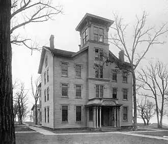 The cornerstone of the building was laid on June 15, 1855, at what is now the corner of Hinman and Davis streets in Evanston. The three-story frame building was completed by the start of the university's first classes on November 5 of that year at a total cost of $5,937.[1] From its completion, Old College was home to all activities of the new university and originally housed a chapel, classrooms, and rooms for two literary societies. Attic lofts also served as dorm rooms for several students.[2] In 1856, the Board of Trustees met in Old College and appointed a Committee on Library, officially establishing Northwestern's first library in Old College. This remained the main library on campus until the construction of University Hall.[3]