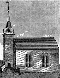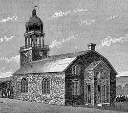 In 1712 the church requested a royal charter; seven years later it was granted by King George I in exchange for a peppercorn in rent every year.[9] Two years later, in 1721, it was expanded, early in the half-century tenure of Dominie Petrus Vas. A doop huys, a sort of chapel, was built to handle baptisms, meetings and other consistorial activities. Vas would, three decades later, oversee the construction of a second church building. Surviving prints show a gambrel-roofed meetinghouse two bays wide with a tower on the front. Its siding seems to have been limestone rubble, although the first print shows a material that could be either in a coursed ashlar pattern or parging to mimic coursed stone. Fenestration consisted of three round-arched windows along the sides. It was dedicated on November 29, 1752, by Georg Wilhelm Mancius, Vas's assistant.[2]