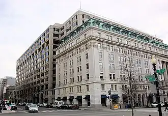 The restaurant was first threatened with demolition in 1962. Around the corner from the restaurant on 15th Street NW and across the street from the U.S. Treasury Building stood the nearly block-long Keith-Albee Building designed by noted architect Jules Henri de Sibour and Rhodes' Tavern, the first polling place in the city, the first city town hall, and the place where citizens of the District of Columbia first petitioned Congress for the right to vote.[83] Developer Morris Cafritz, who purchased the Keith-Albee Building and Rhodes' Tavern in 1956, wanted to tear down the entire half-block to construct a new office building.[84]