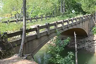 The Old Highway 16 Bridge is a historic closed-spandrel arch bridge near Edgemont, Arkansas. It carries an unused old alignment of Arkansas Highway 16 across the manmade "Edgemont Cut", an excavation made in 1908 during construction of the now-abandoned Missouri and North Arkansas Railroad. The bridge was built in 1936 with funding from the Works Progress Administration, and remained in regular service until 1963, when Highway 16 was realigned. In that year, the United States Army Corps of Engineers moved the road north to its present alignment, filling in part of the old railway cut. The bridge is subject to flooding during exceptionally high water events in Greers Ferry Lake.[2]