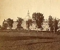 In 1825, the Main College consisted of two three-story 75 feet (23 m) x 36 feet (11 m) buildings known as the "North and South Colleges". A third three-story building (with a length of 86 feet (26 m)), known as the "Middle College" was erected between the two in 1829. Each of the buildings was constructed about 7–8 feet apart to prevent fire from destroying the entire facility, as had occurred previously in 1824. In 1846, the buildings were connected, however they were not accessible to one another within.[3] The building has undergone substantial renovations several times.
