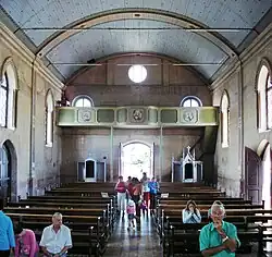 The interior has a single nave and a chancel at the back with a predominance of the neo-Gothic style. The entrance is located under a wooden choir supported by two slender octagonal columns and decorated with simple paintings (Saint Cecilia, King David with the psaltery and another unidentified saint) in three medallions along the parapet. Also under the choir are two wooden confessionals, one on either side of the entrance.[2]