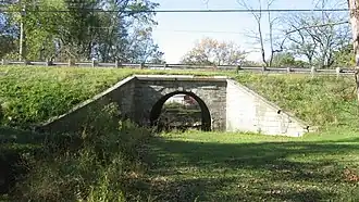The Old Stone Arch is a stone arch bridge along the former route of the National Road in Marshall, Illinois. The limestone bridge is 13.5 feet (4.1 m) high and 15 feet (4.6 m) across. The U.S. Army Corps of Engineers built the bridge between 1828 and 1837, the period in which the Corps rebuilt much of the National Road. The National Road, the most-traveled U.S. road in the early 1800s and the first built by the U.S. government, connected Illinois to the Eastern United States and helped bring settlers and goods to the state during its early years. The bridge has served road traffic continuously since its construction and was part of U.S. Route 40 from the route's creation to 1953.[2]