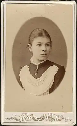 When she was seven years old, she was sent to the First Women's Parish School but, after studying there for one year, she began being tutored at home by her older sister, Anna. From 1883 to 1887, Ulyanova studied at the Mariinsky Women's Gymnasium in Simbirsk.[1] She graduated with honors.[3] Ulyanova applied for a teaching position in Samara but was denied the post due to being related to a state criminal, as her brother, Alexander, had been executed in 1887 for revolutionary tendencies.[1][3] In April 1890, she received a certificate of reliability and, in the fall of that year, was admitted to the Bestuzhev Courses in St. Petersburg.[1][3] She studied physics, mathematics, English, German, French, Swedish, Latin, Italian, and drawing while enrolled at Bestuzhev.[1] She had hopes of studying medicine.[3]