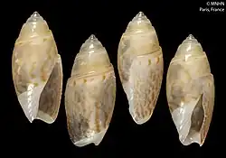 | Shell of Olivella olssoni (specimen at MNHN, Paris) | |