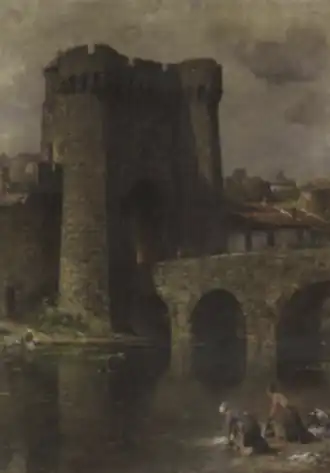 On a French River is an impressionist oil painting on canvas painted by the artist Emma Lampert Cooper during the late 1800s. It is a landscape painting that depicts a river scene in Parthenay, France. It is part of the permanent collection at the Memorial Art Gallery (MAG) in Rochester, New York.[1]Emma Lampert Cooper's husband, Colin Campbell Cooper,[2] also produced similar paintings in the same location when they traveled together. Specifically, the paintings titled Port St. Jacques, Parthenay, France, and A View of a European Village. Both of these paintings have been auctioned in the past and are privately owned.[3][4]