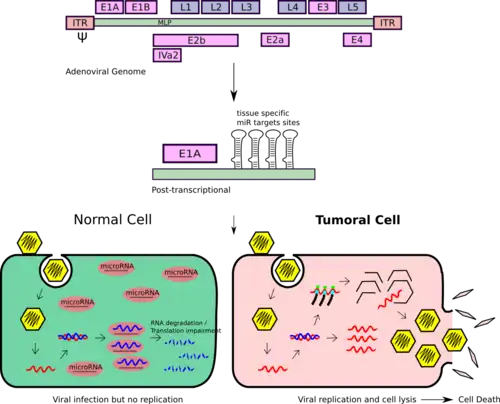 - ^ Ylösmäki E (2008). "Generation of a conditionally replicating adenovirus based on targeted destruction of E1A mRNA by a cell type-specific MicroRNA". Journal of Virology. 82 (22): 11009–11015. doi:10.1128/JVI.01608-08. PMC 2573287. PMID 18799589.