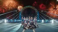 The music video primarily highlights the group's choreography, showcasing their performance on multiple sets ranging from a "luxurious" dining hall to a minimalist white soundstage. An elevator with floor numbers representing time passing between their debut date as a group and the release date for their song "One Spark" is intermittently featured throughout the video. In one set, group member Dahyun is also seen crying in a dance studio and being comforted by other members, which depicts the hardships the group went through during their past as Korean idol trainees. The video concludes with the K-pop act dancing on Chuncheon Bridge, which was closed to traffic for filming, as fireworks illuminate the scene.[1][11][14]
