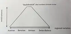 According to Dollinger, "pluriareality" is counter to "pluricentricity" and the latter violates the uniformitarian principle; it is an "empty term" and does not meet basic epistemological requirements. Dollinger shows evidence that "pluriareal" is identical with "geographical variation" and thus no match for the theory of pluricentricity.[13] He argues for the recognition of independent standard varieties of German, each based on the dialects of the three national territories Austria, Germany, and Switzerland, according to Figure 2.[14]