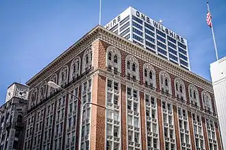 The One Wilshire building (pictured behind the brownstone) is said to be "the main hub of the internet for the entire Pacific Rim,"[8] due to the large concentration of telecommunications companies as tenants.[4]