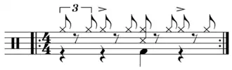 The backbeat is characterized by the dominant snare drum stroke (usually a click produced by cross-sticking) and bass drum both sounding on the third beat of every four, while beat one is left empty. Thus, the expected hit on beat one is "dropped," creating the one-drop effect. Dropping out the bass on the "one" of the measure further accentuates the downbeat of the drums creating the rhythm.[12]