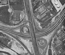 However, at the same time, Toronto was embroiled in heated debate over the fate of its planned urban expressway system. When the Spadina Expressway was cancelled in 1971, the planned Belfield Expressway was completely revised. Instead of continuing northwest from Highway 427 and through Malton's four-corners at Derry Road and Airport Road towards Brampton, it would curve southwest and provide access to the developing Toronto International Airport.[8] At the recently opened interchange between Highway 401 and Highway 427, the off-ramp from westbound Highway 401 to Carlingview Drive was temporarily signed as "Airport Expressway", since Carlingview Drive had a temporary on-ramp to northbound Highway 427 near the Renforth Drive underpass but that on-ramp was closed in the early 1970s. Direct access from westbound Highway 401 to northbound Highway 427 would be restored a few years later with the Belfield Expressway which had greater capacity then the short-lived Carlingview ramps.[9][10]