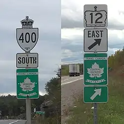 A Trans-Canada Highway marker mounted under a Highway 400 shield (left), with the TCH departing the 400 to follow Highway 12 (right)