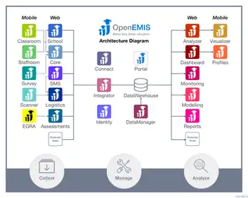 OpenEMIS is a suite of interrelated software that supports data collection (Survey; Classroom; Staffroom), management (Core; School; Integrator), and analysis (Visualizer; Monitoring; Dashboard; Analyzer; DataManager; Profiles).[4] Each application is designed to provide unique standalone features to support different information management requirements at different levels.[5] These features could be customized and integrated with existing systems.